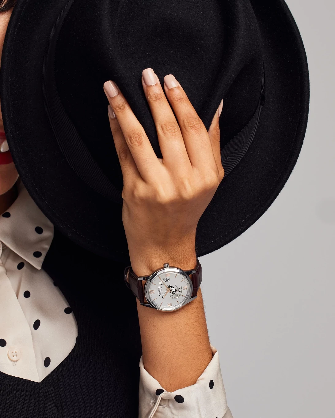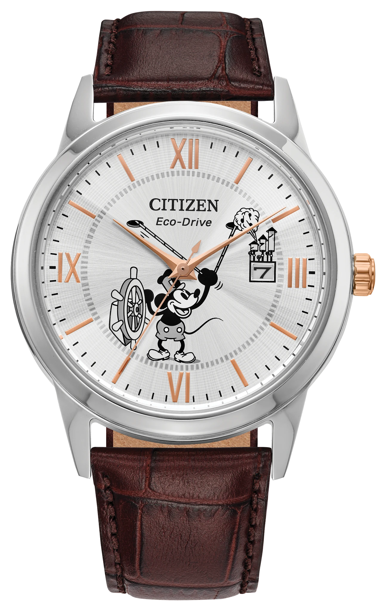 Take a voyage back in time: In 1928, a star was born when Walt Disney… Studios released an animated short film featuring a lovable character known worldwide as Disney?s Mickey Mouse. Now, the Disney | Citizen Steamboat Willie 1928 watch pays homage to that cinematic milestone with a vintage-inspired black-and-white illustration by Disney artist Jeff Shelly showcasing the character setting off the boat?s whistle on a silver-tone dial with rose gold-tone accents. Citizen first produced this watch as part of Walt Disney?s 100th anniversary celebration in 2023, and this new version is refreshed with an embossed brown leather strap. The keepsake Steamboat Willie 1928 timepiece is sustainably powered by any light with our Eco-Drive technology and never needs a battery. ?Disney