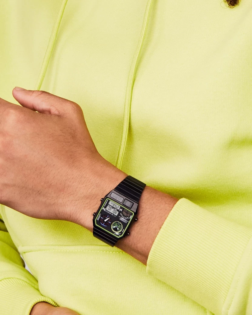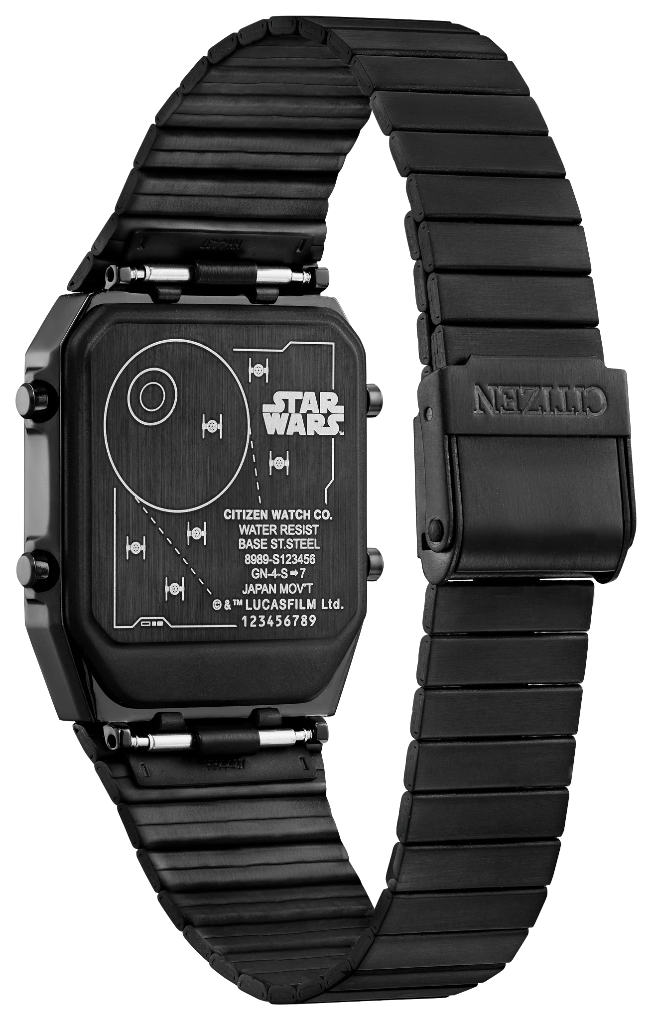 Star Wars™ fans new and old alike will want to be part of the action with this exclusive… Trench Run watch from Citizen. Inspired by an original Citizen analog-digital watch from the 1980s, it features a rectangular black stainless steel case, with a dial packed with features, including dual time in both X-Wing and Tie Fighter Pilot views, an alarm, the digital time, and the temperature, making it a unique and stand-out timepiece. This watch requires a battery. No matter which side of The Force you are loyal to, this Star Wars watch will always be up for the job — whether it’s the Kessel Run or a daring attack on the Death Star™.