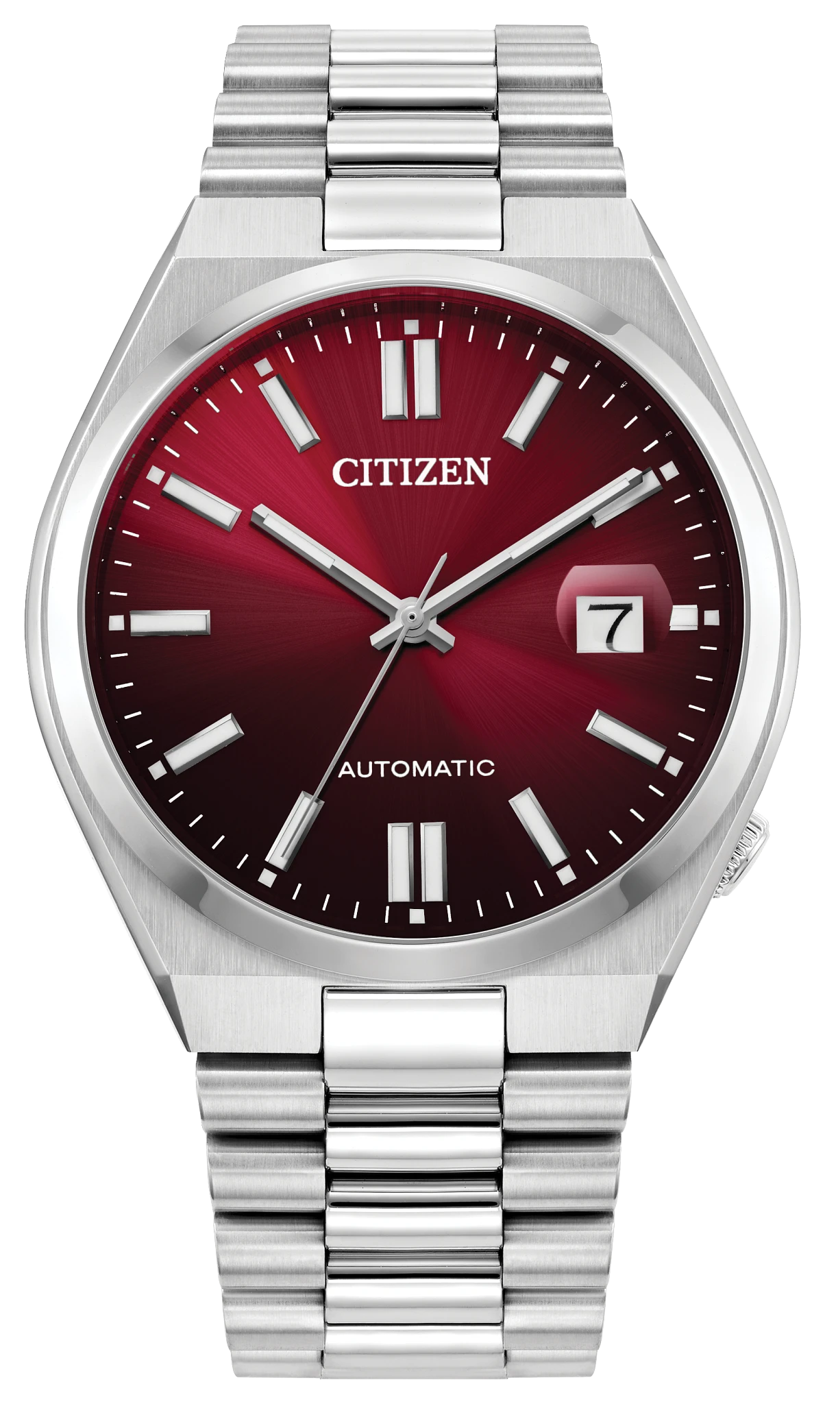 The TSUYOSA Automatic, from the NJ015 series, brings ultramodern sports… styling right to your wrist. Executed in a versatile 40mm footprint, the sophisticated design of the watch makes a strong impression via a silver-tone stainless steel case and a seamlessly integrated, matching bracelet. Underneath an anti-reflective sapphire crystal, the sporty timepiece makes use of a sunray burgundy dial, with a 3 o?clock date window and contrasting silver-tone details adding to its classic aesthetic. Powered by an automatic movement and offering up to 50 meters of water resistance, the refined timepiece is a daily wearing choice ready for work, play, and everything in between. Caliber 8210.