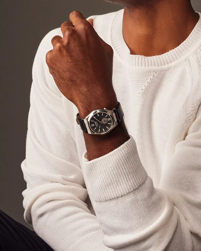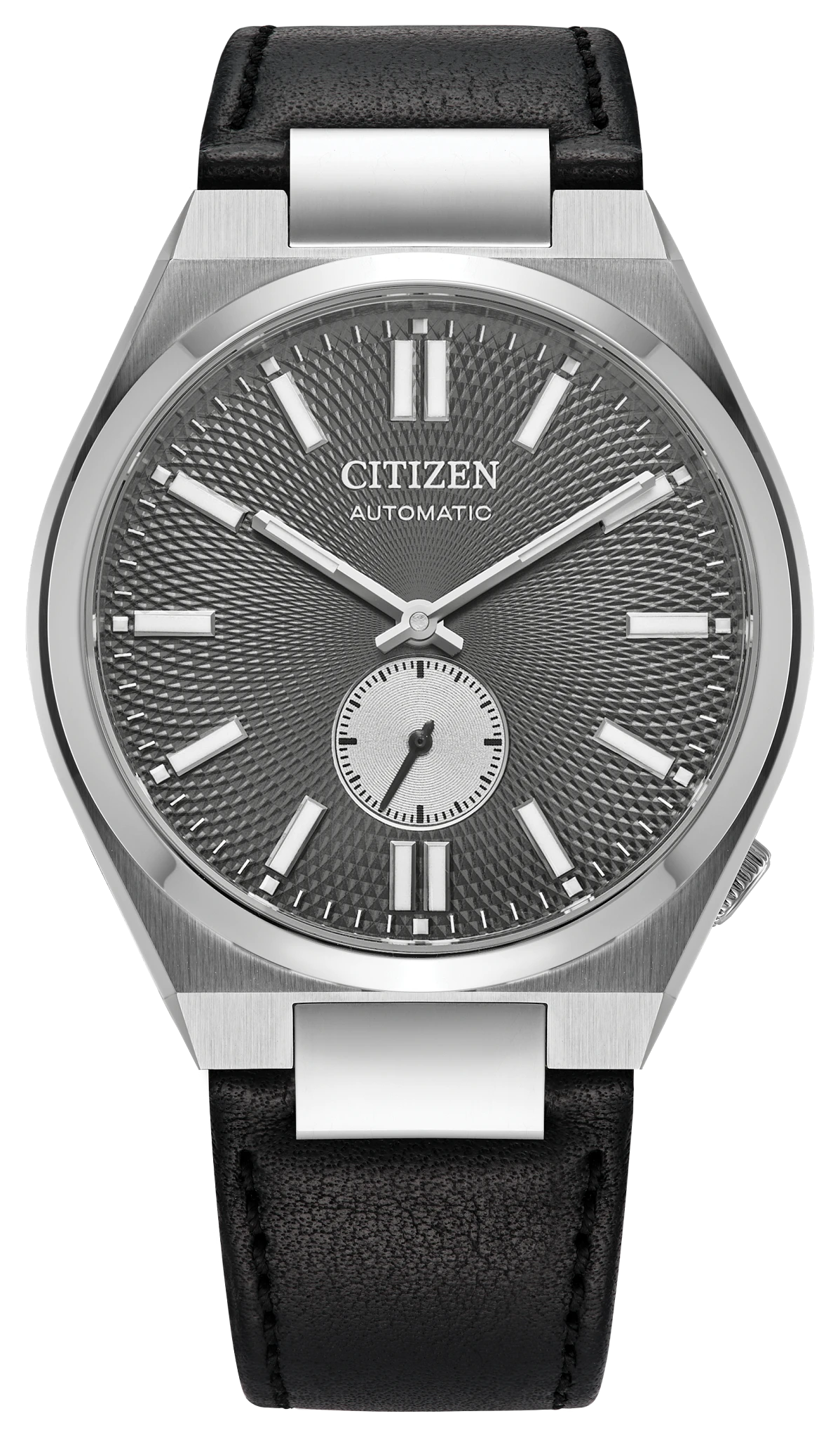 The TSUYOSA Small Second Automatic brings ultramodern all-purpose styling… right to your wrist. Executed in a versatile 40mm footprint, the sophisticated design of this timepiece makes a strong impression via a silver-tone stainless steel case and a seamlessly integrated, quickly interchangeable black leather bracelet. A recessed crown at the 4 o’clock position adds to the watch’s sleek silhouette, while an automatic movement capable of a 60-hour power reserve supports its reliable performance. Underneath an anti-reflective sapphire crystal, the sporty timepiece makes use of a textured gray dial, with a contrasting 6 o?clock seconds counter and lume-accented details adding to its instant-classic aesthetic. Water resistant up to 50 meters, the refined timepiece is a daily wearing choice ready for work, play, and everything in between. Caliber 8322.With a range of proprietary TSUYOSA Small Second Automatic interchangeable 22mm straps available for purchase, this watch seamlessly transitions from elevated to classic. *Interchangeable straps are only compatible with TSUYOSA styles NK5010-51L, NK5010-51X and NK5010-01H.