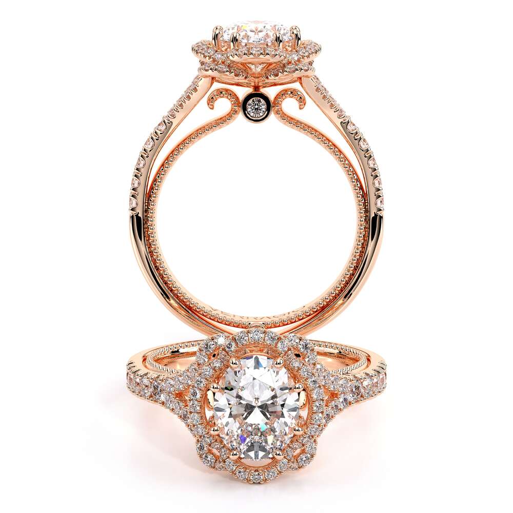 COUTURE-0426OV Blossom Double Floret Halo Engagement ring pave set with round brilliant diamonds featuring the Verragio Bezel set and upward Scrollwork Signature Beading profile completed with the Couture pointed shank.