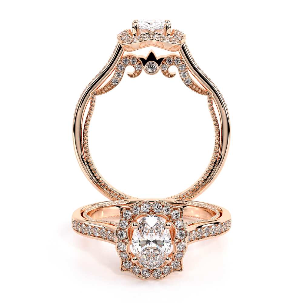 INSIGNIA-7092OV is our vintage engagement ring which showcases a handcrafted Victorian halo designed to enhance your round center stone. Adorned with meticulously set round brilliant-cut diamonds amid Insignia’s distinctive diamond scrollwork Verragio’s timeless signature beading and crest.