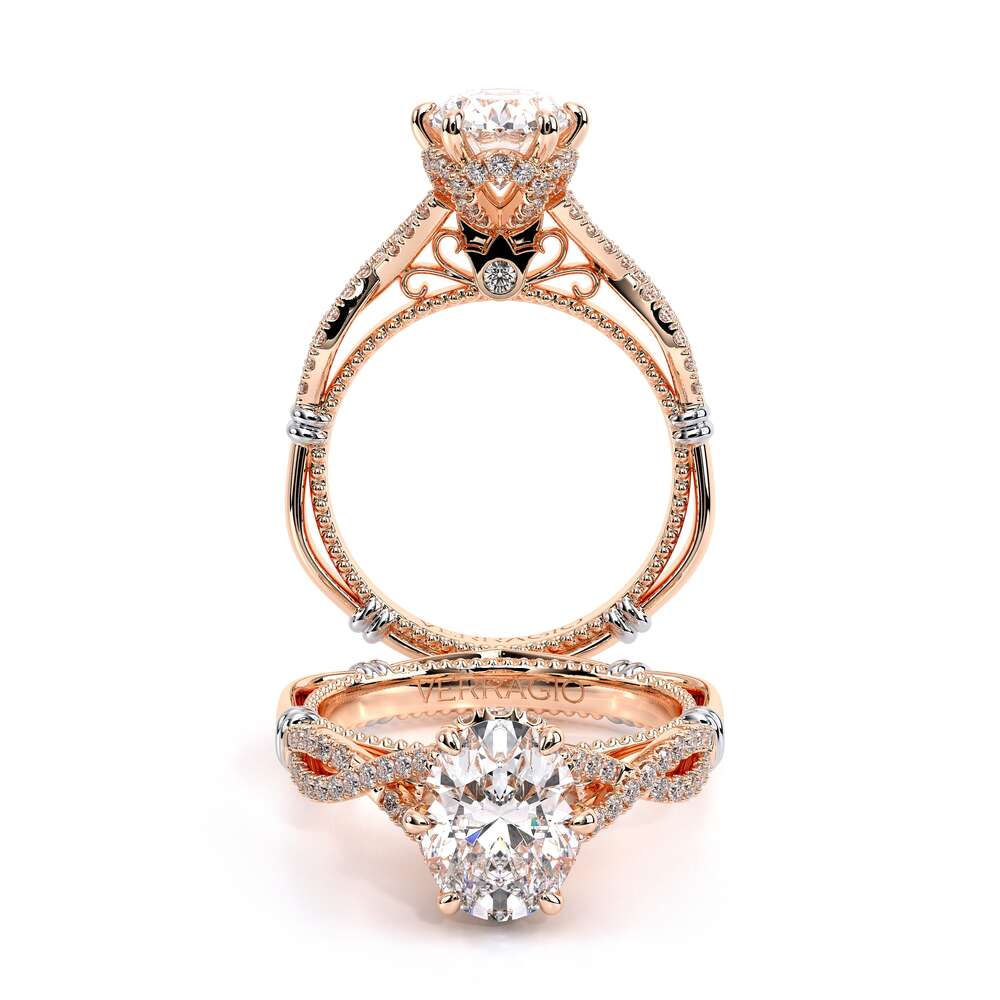 Parisian-153OV is a uniquely designed engagement ring that showcases Verragio’ s diamond encrusted tiara that enhances a princess diamond center. The details continue through with the addition of the Timeless wraps Parisian lace and Verragio signature beading.