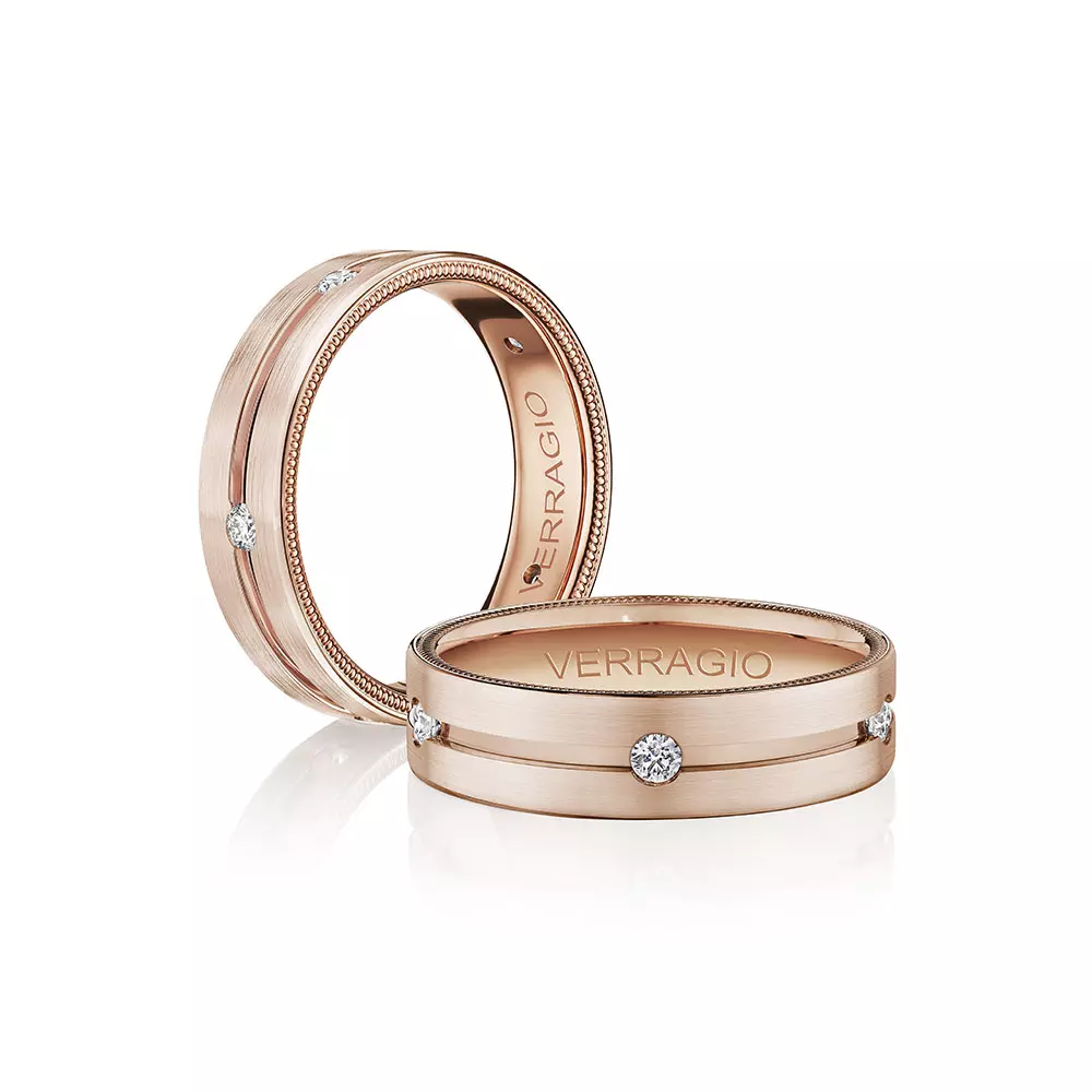 VWD-6921 is our sophisticated 6MM width diamond men’s band with a matte finish. Adding to the elegance of this band are round brilliant-cut diamonds along a singular rose gold etched grove. Refined by Verragio’s signature rose beading.
