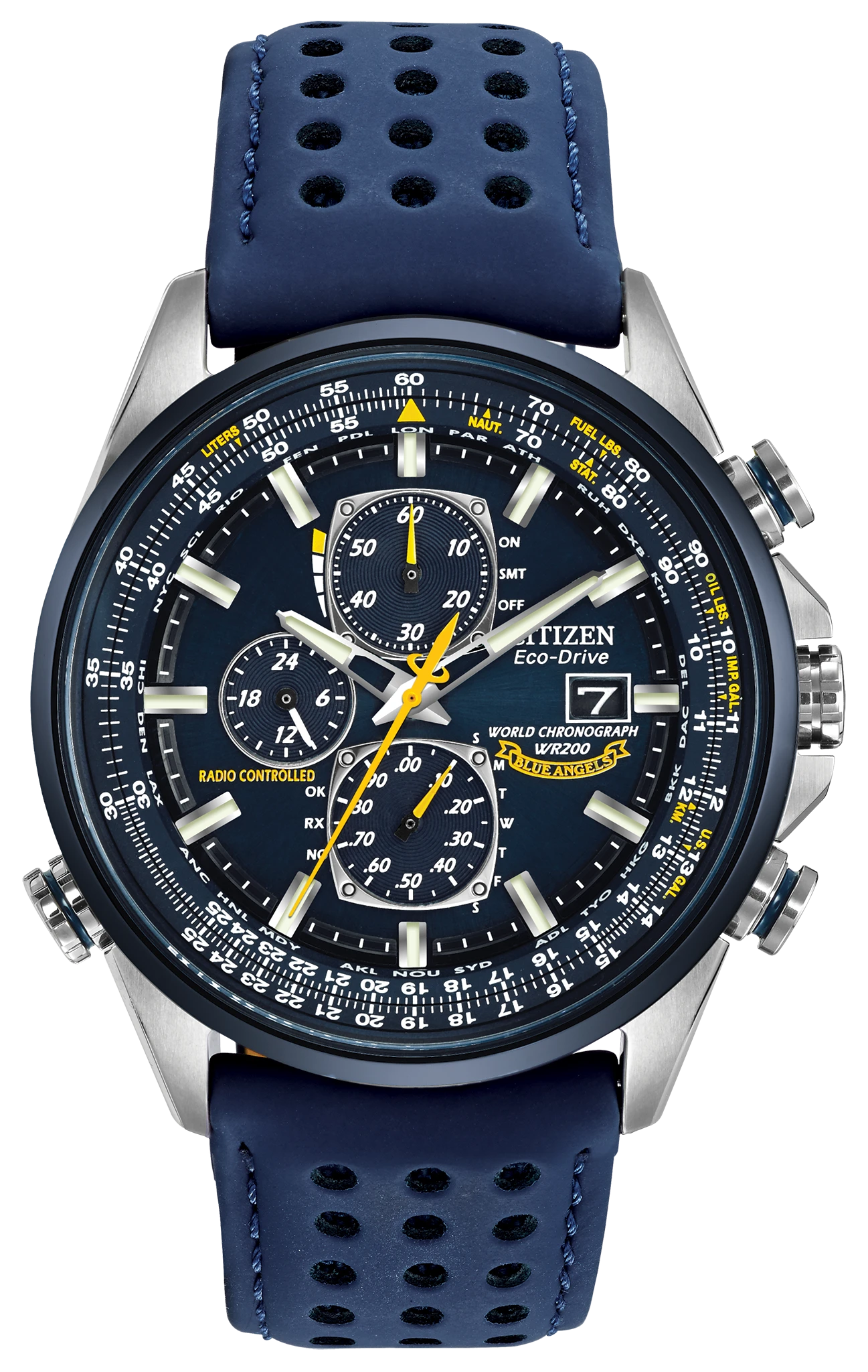 Citizen Eco-Drive Radio-Controlled Chronograph World Timer; Blue Angels edition… with caseback insignia. Atomic time in 26 world cities; radio-controlled accuracy in 5 zones. 1/20 second chrono up to 60 minutes, perpetual calendar, 12/24 hour time, power reserve, non-reflective sapphire crystal. Stainless steel, blue ion plating, leather strap. Featuring our Eco-Drive technology – powered by light, any light. Never needs a battery. Caliber number H800.
